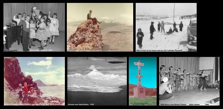 (Second from left, top row) this is from Mount Reed, view is east northeast. The nearest lake is Lake D'Marie, just behind it closer to Sitkin is the little round Mitt Lake. At far left you can see the runway and Adak town.