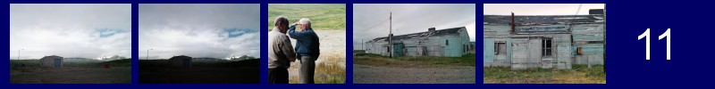 This photo strip is a bit confusing. It appears to be the old buildings north of the northeast end of the runways. The first two photographs are really the same photo; the first scan emphasizes the building, the second emphasizes the sky. The men gazing at the old buildings are interesting, but a clue exists in the background, the two-track road coming down to a dirt pad. Obviously, something these men remember once existed at this location. Finally, two photographs of an old building. Notice how the boards were applied on diagonals to make the building resistant to extreme wind. In fact, it has been here for about 50 years and has withstood typhoon force winds of over 120 mph. The old wood makes superb picture frames, since windblown sand etches the grain very deeply and makes it feathery soft to the touch. It isn't very strong and it does not burn well; the volatile components (sap, resin) have long ago been leached away by the endless rain.