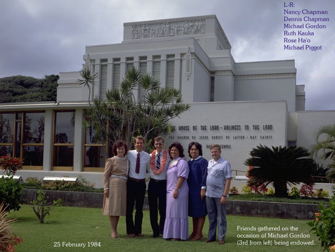 25 February 1984: Accompanied by friends (Nancy and Dennis Chapman, myself, Ruth Kauka, Rose Ha'o, Michael Piggott) received the endowment at the Hawaii Temple. (Clicking the photo gets you a medium size picture, but if you want a REALLY BIG ONE then you know where to click!) |